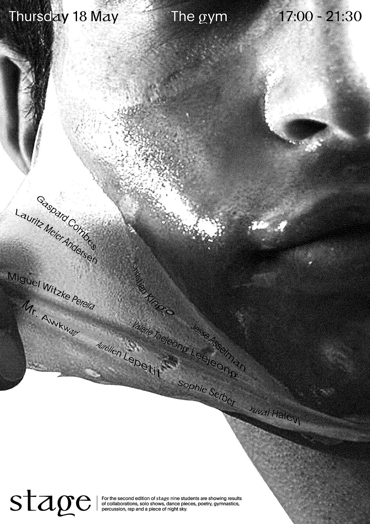 For the second edition of STAGE nine students are showing results of collaborations, solo shows, dance pieces, poetry, gymnastics, percussion, rap and a piece of night sky.