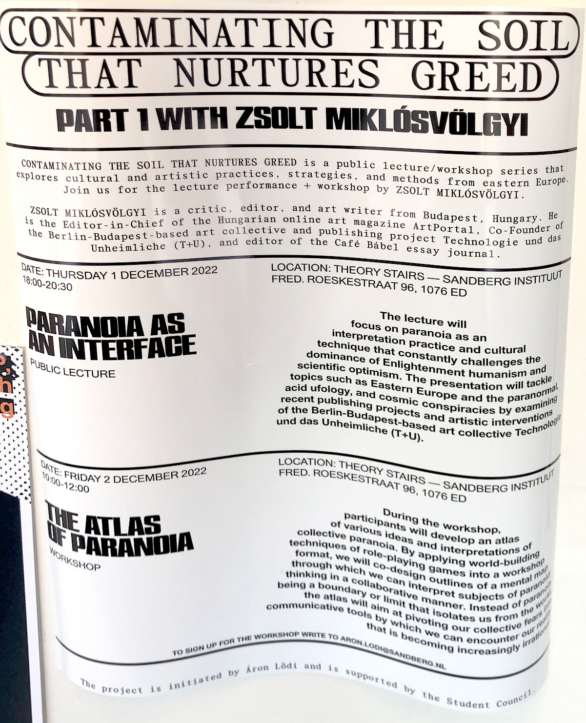 The lecture will focus on paranoia as an interpretation practire and cultural technique that constantly challanges the dominance of Enliightenment humanism and scientific optimism. The presentation will tackle topics such as Eastern Europe and the paranormal, acid ufology, and socmic conspiracies by axamining recent publishing projects and artistic interventions of the Berlin-Budapest-based art collective Technology und das Unheimliche (T+U).