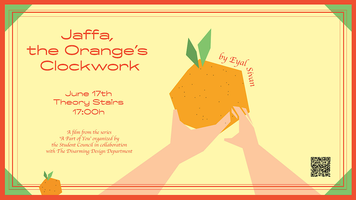The Student Council would like to invite you to “JAFFA, THE ORANGE'S CLOCKWORK” by Eyal Sivan, a film screening in collaboration with the Disarming Design department.
