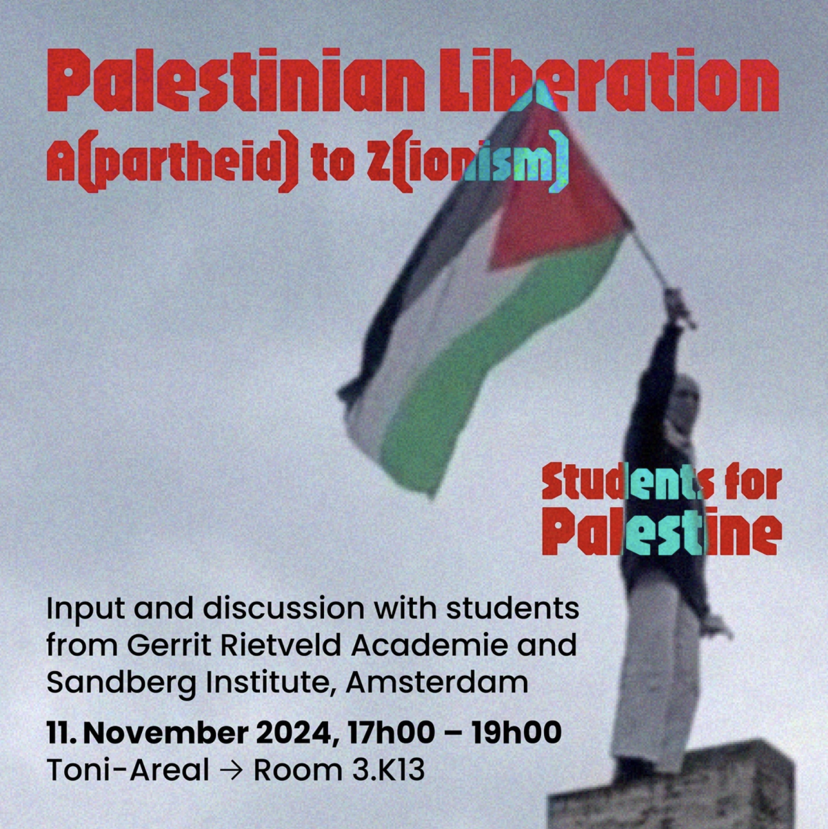 Students for Palestine ZHAW/ZHdK are excited to host a powerful discussion with students from the University of Gerrit Rietveld Academie and the Sandberg Institute in Amsterdam. They’ll be sharing their experiences and strategies in the fight for an academic boycott and shedding light on their approach to activism within their institution. This is an open platform for discussion, where we aim to learn from each other’s student movements, unite and grow for the cause of the liberation of Palestine. Whether you’ve been involved in the student movement or not, curious about activism, or just interested in exploring new perspectives, everyone is encouraged to join, let’s learn and grow together!