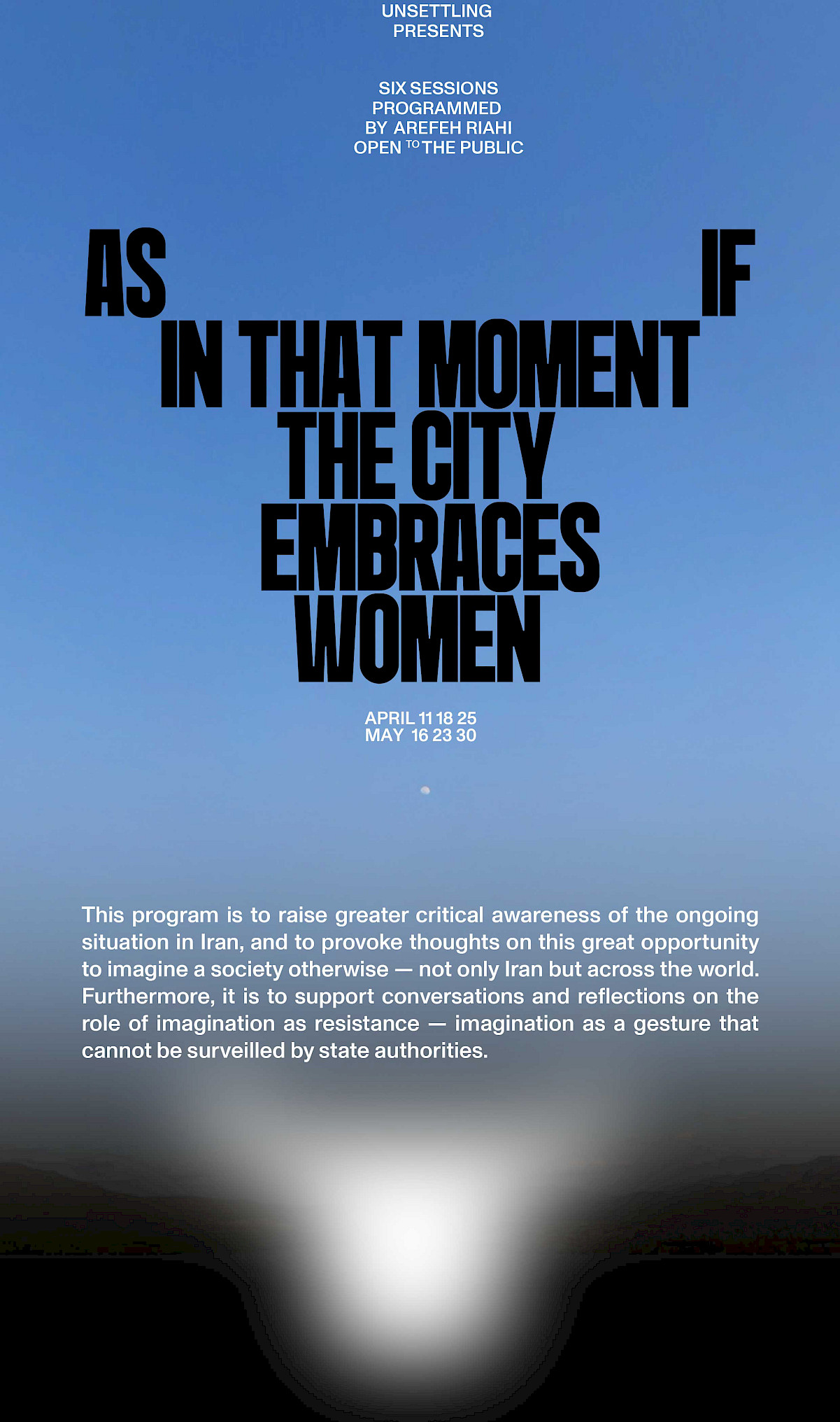 This program is to raise greater critical awareness of the ongoing situation in Iran, and to provoke throughs on this great opportunity to imagine a society otherwise — not only in Iran by across the world. Furthermore, it is to support conversations and reflections on the role of imagination as resistance — imagination as a gesture that cannot be surveilled by state authorities.