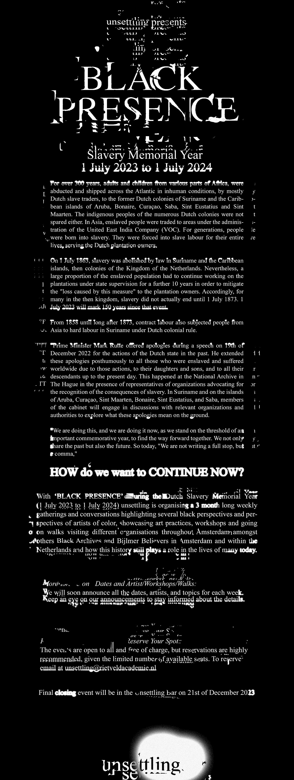 With ‘BLACK PRESENCE’ during the Dutch Slavery Memorial Year (1 July 2023 to 1 July 2024) unsettling is organizinga 3 month long weekly gatherings and conversations highlighting several black perspectives and perspectives of artists of color, showcasing art practices, workshops and going on walks visiting different organizations throughout Amsterdam amongst others Black Archives and Bijlmer Believers in Amsterdam and within the Netherlands and how this history still plays a role in the lives of many today.