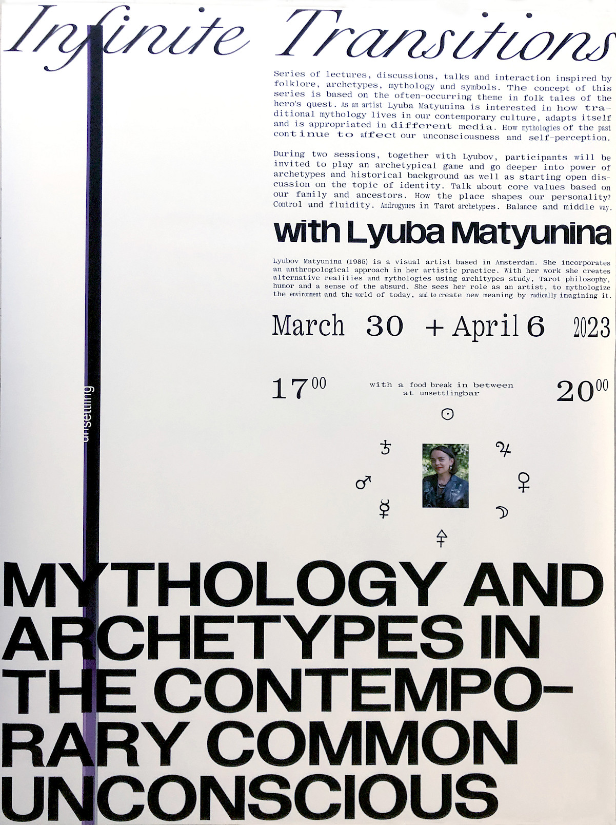 Series of lectures, discussions, talks and interactions inspired by folklore, archetypes, mythology and symbols. The concept of this series is based on the often-occurring theme in folk tales of the hero’s quest. As an artist Luba Matyunina is interested in how traditional mythology lives in our contemporary culture, adapts itself and is appropriated in different media. How mythologies of the past continue to affect our consiousness and self-perception.