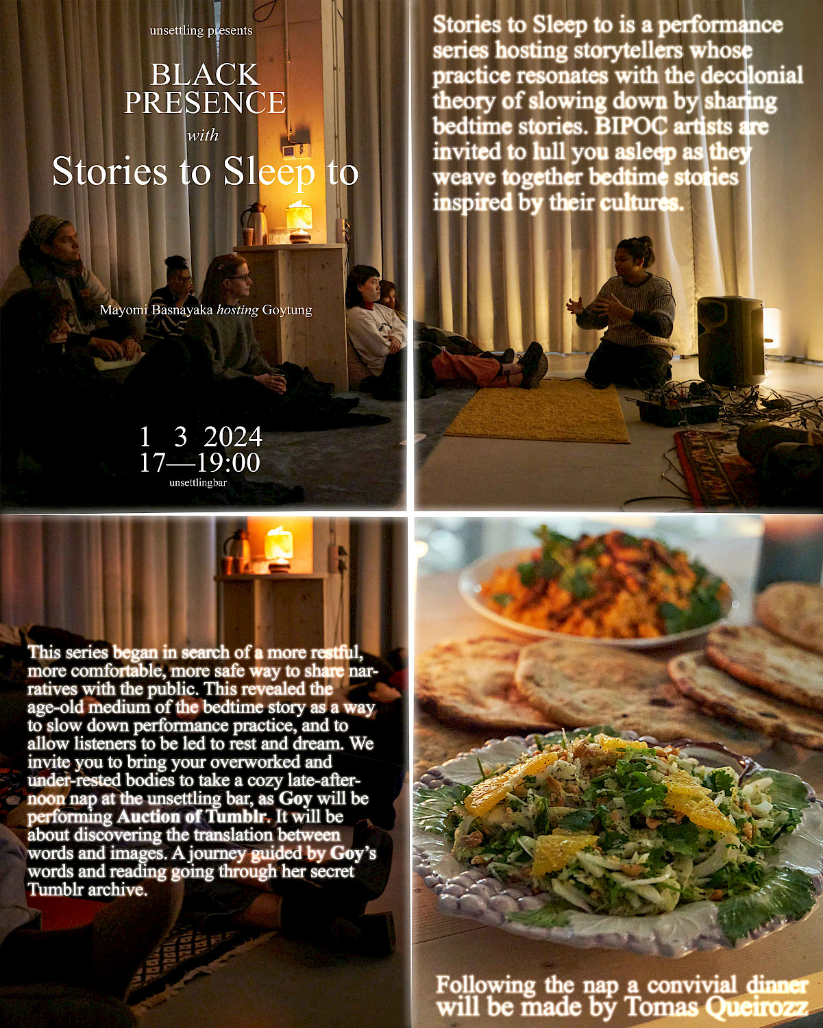 This series began in search of a more restful, more comfortable, more safe way to share narratives with the public. This revealed the age-old medium of the bedtime story as a way to slow down performance practice, and to allow listeners to be led to rest and dream. We invite you to bring your overworked and under-rested bodies to take a cozy late-afternoon nap at the unsettling bar, as Goy will be performing the Auction of Tumblr. It will be about discovering the translation between words and images. A journey guided by Goy’s words and reading going through her secret Tumblr archive.