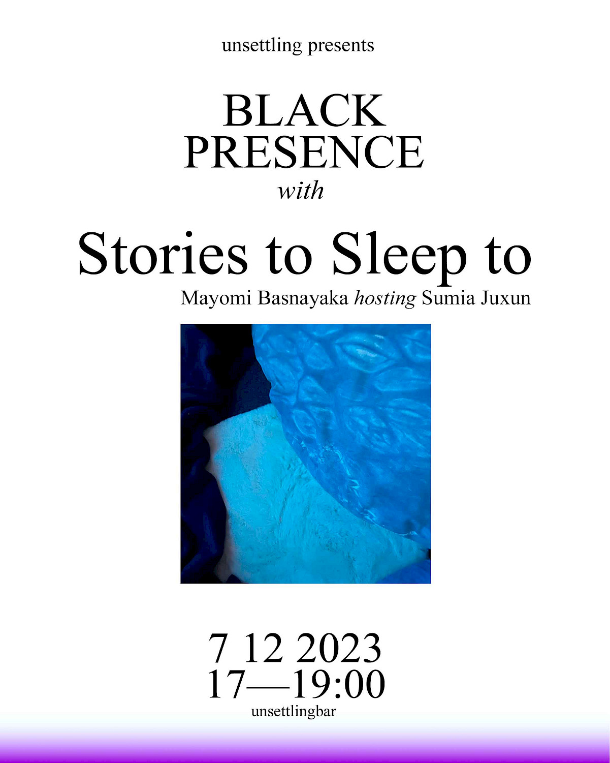 This series began in search of a more restful, more comfortable, more safe way to share narratives with the public. This revealed the age-old medium of the bedtime story as a way to slow down performance practice, and to allow listeners to be led to rest and dream. We invite you to bring your overworked and under-rested bodies to take a cozy late-afternoon nap at the Unsettling bar, as Sumia Juxun will be performing a bedtime story: Cycles of Return.