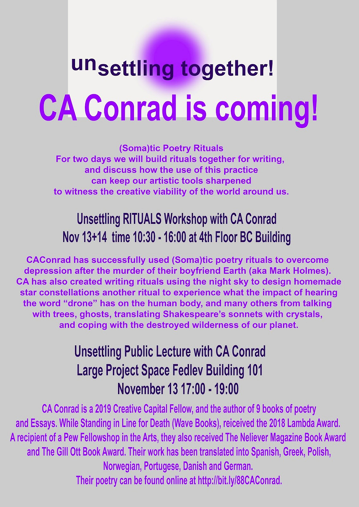 Unsettling has invited poet CAConrad for an annual artist talk: