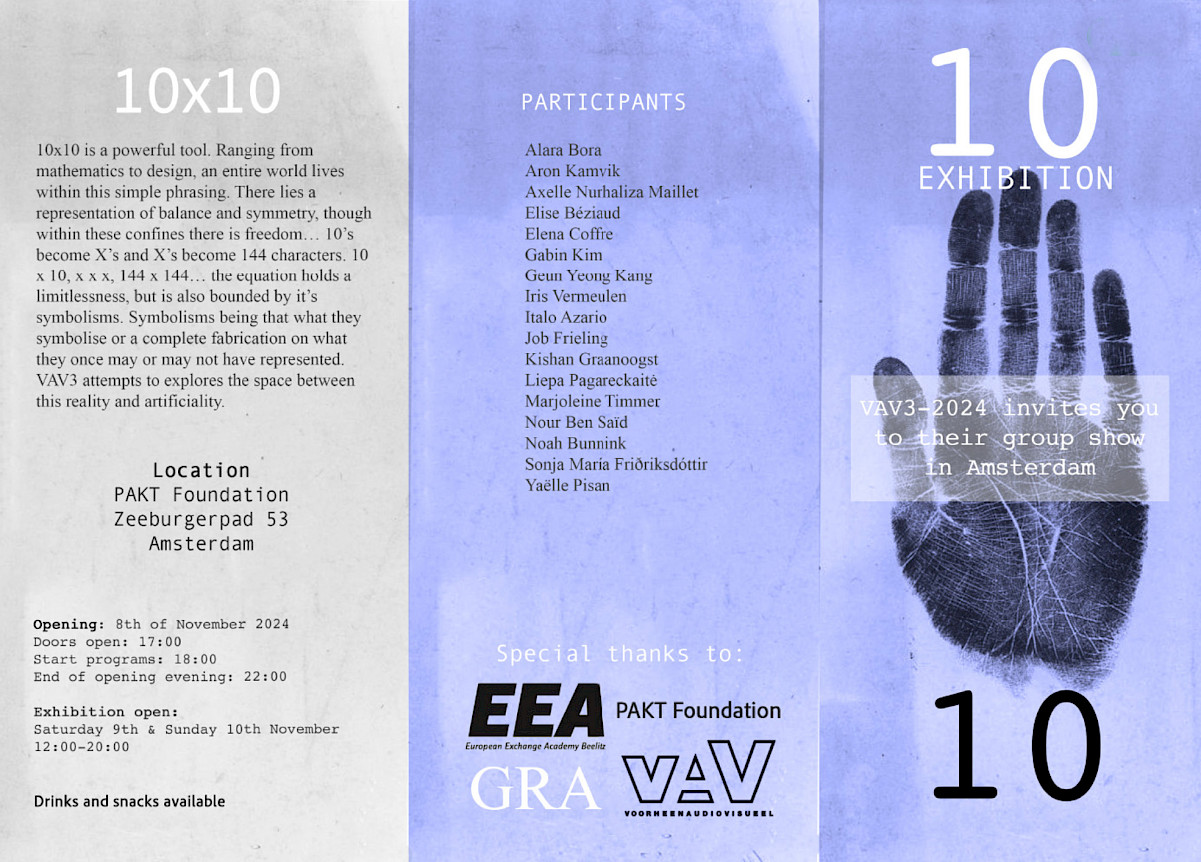 10x10 is a powerful tool. Ranging from mathematics to design, an entire world lives within this simple phrasing. There lies a representation of balance and symmetry, though within these confines there is freedom… 10’s become X’s and X’s become 144 characters. 10 x 10, x x x, 144 x 144… the equation holds a limitlessness, but is also bounded by its symbolisms. Symbolisms being that what they symbolize or a complete fabrication on what they once may or may not have represented. VAV3 attempts to explores the space between this reality and artificiality.