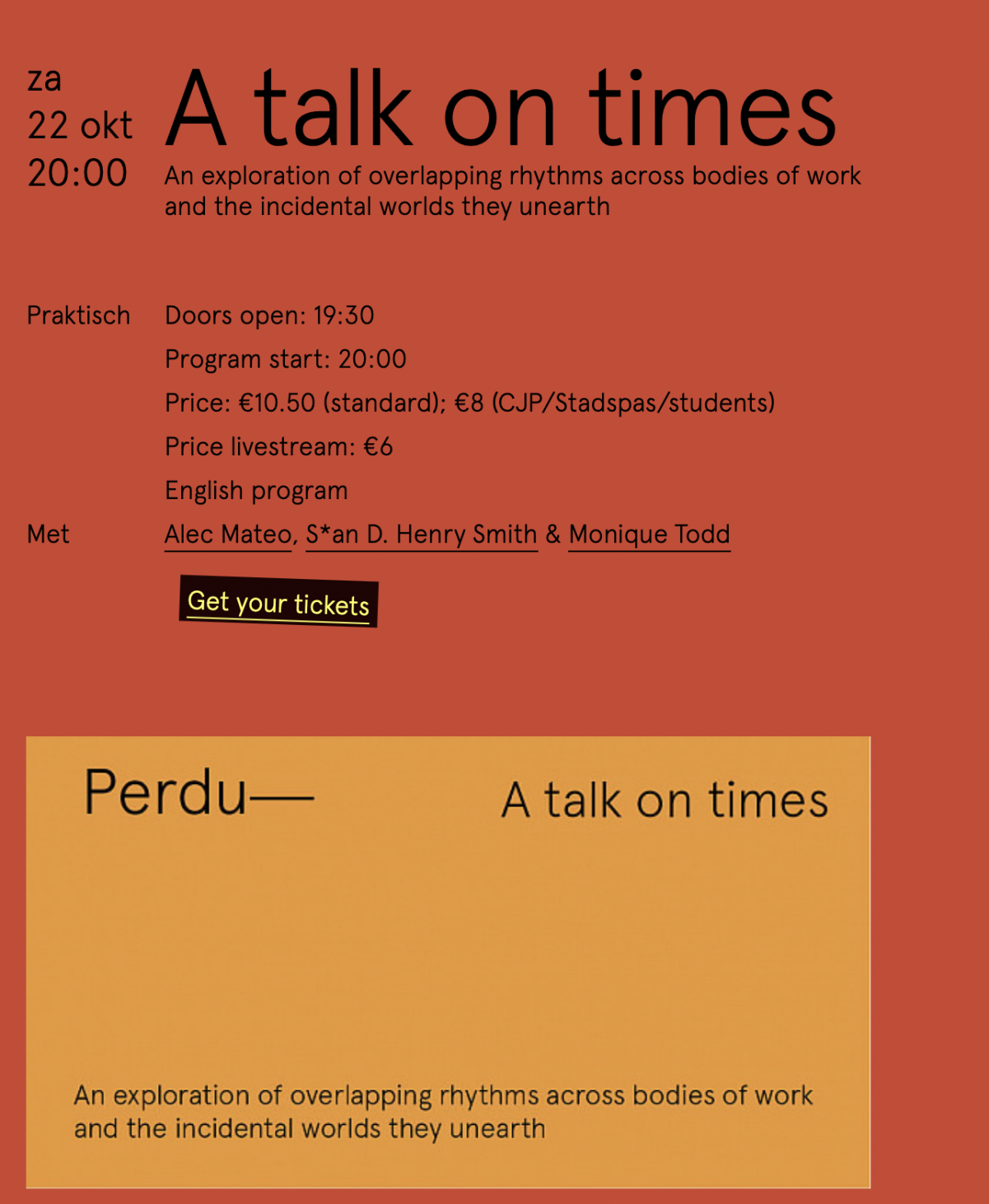 An exploration of overlapping rhythms across bodies of work and the incidental worlds they unearth. A performance by S*an D. Henry Smith and Alec Mateo. Production and Composition Assistance by Monique Todd.