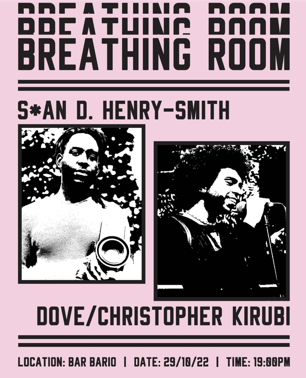 In this event Metro54 invites poet and artist S*an D. Henry-Smith to host Breathing Room. For this first program, Henry-Smith, alongside fellow poet/artist Dove/Christopher Kirubi, will offer poetry readings at Bar Bario. Together, Kirubi and Henry-Smith will share a conversation on breath, sound, and movement as it relates to their practices.